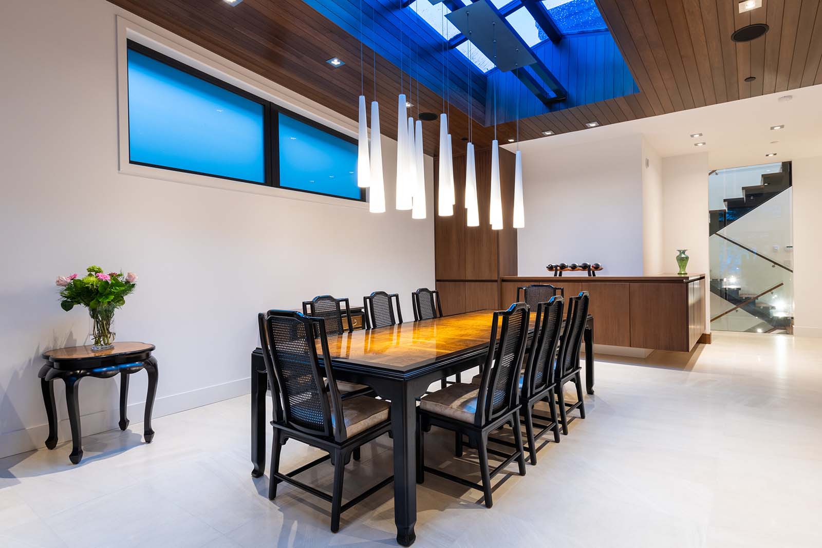 The home’s sleek, modern aesthetic is balanced by the warmth of hardwood open-rise stairs, stone tiling, walnut flooring and custom-made doors. The dining and living room ceilings are paneled with tongue-and-groove hemlock stained to look like walnut.